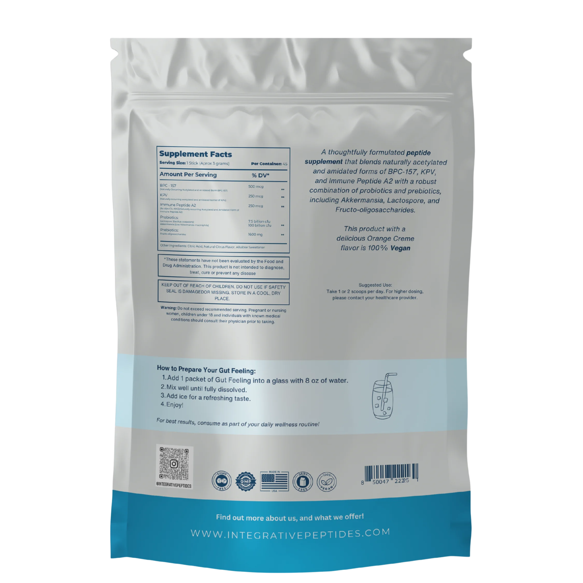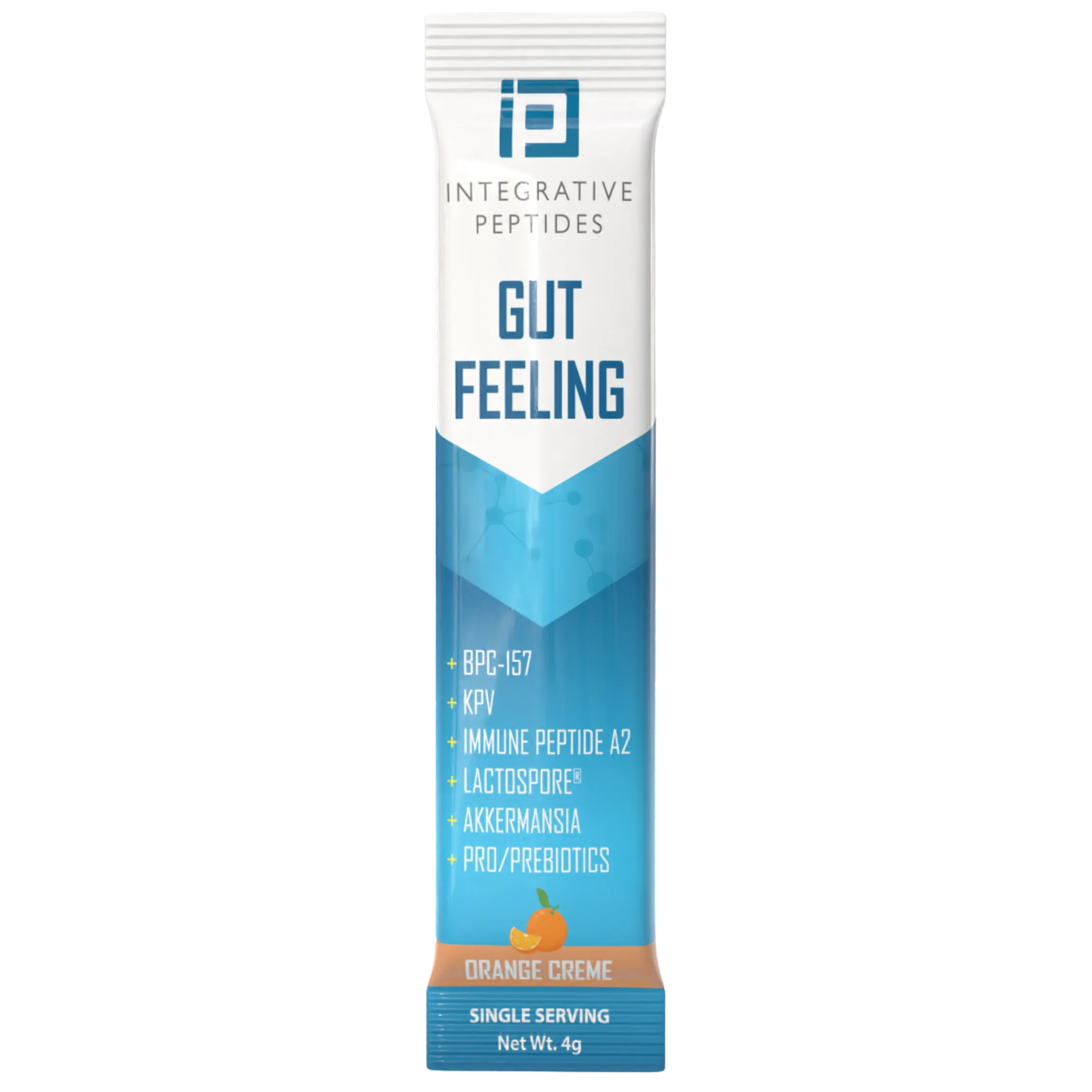 Integrative Peptides Gut Feeling Packets (Orange Creme) is the newest peptide-based drink blend – a carefully formulated supplement that includes naturally acetylated and amidated forms of Body Protection Compound-157, KPV, and Immune Peptide A2, combined with a mix of probiotics and prebiotics such as Immunolin (an animal-derived supplement), Akkermansia, Lactospore®, and Fructo-oligosaccharides.