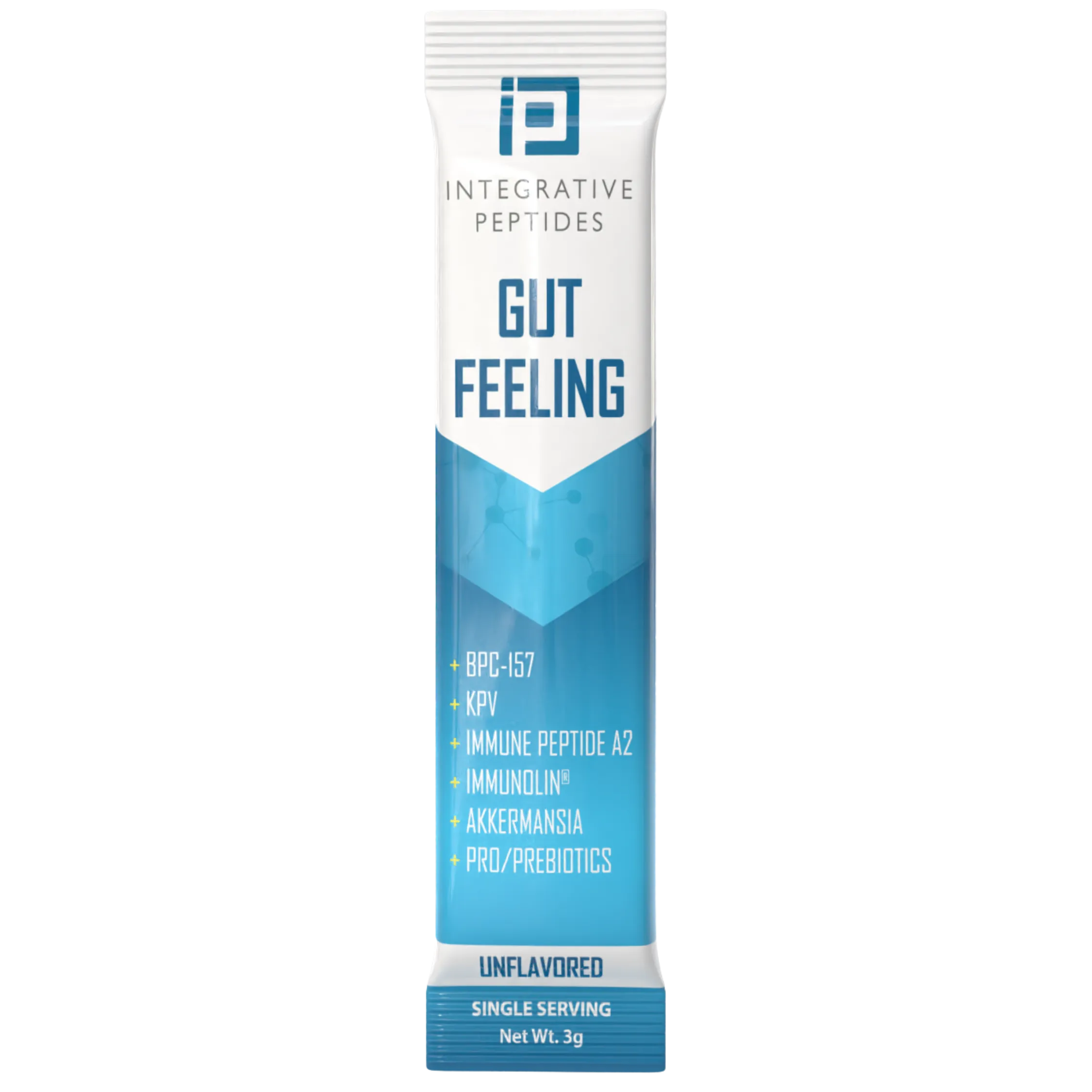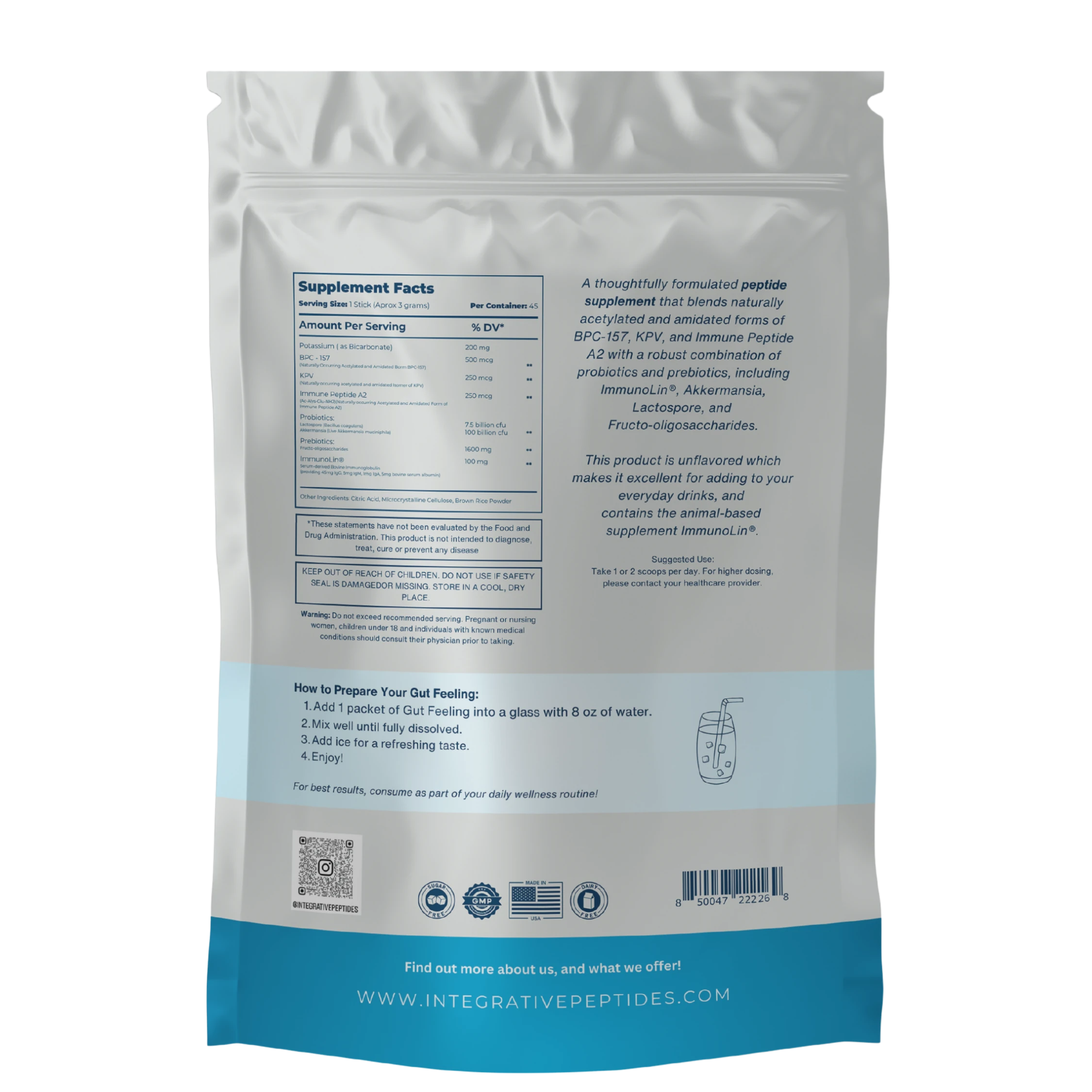Integrative Peptides Gut Feeling Packets (Unflavored) is the newest peptide-based drink blend – a carefully formulated supplement that includes naturally acetylated and amidated forms of Body Protection Compound-157, KPV, and Immune Peptide A2, combined with a mix of probiotics and prebiotics such as Immunolin (an animal-derived supplement), Akkermansia, Lactospore®, and Fructo-oligosaccharides.