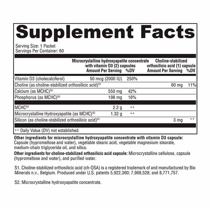 Each packet contains: 2 Microcrystalline Hydroxyapatite Concentrate w/ Vitamin D3 capsules and 1 Choline-stabilized Orthosilicic Acid capsule.